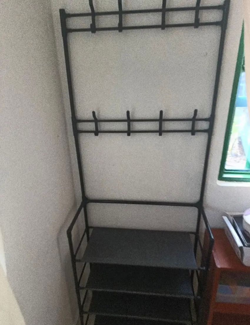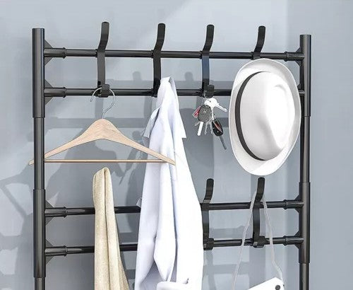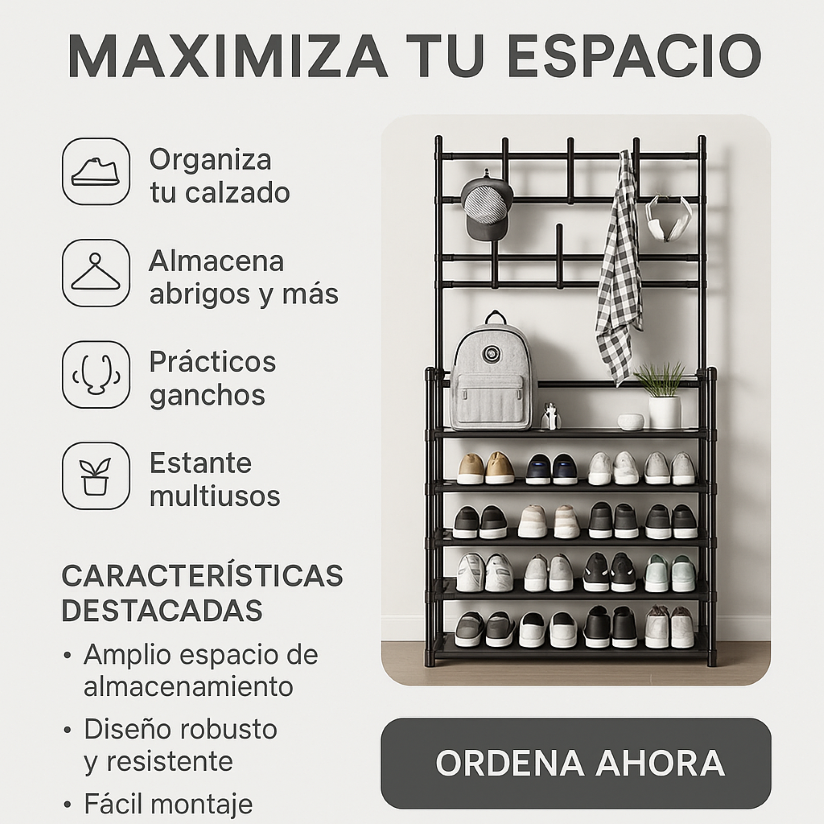 Este elegante organizador de entrada de 5 niveles está diseñado para ofrecerte una solución de almacenamiento completa en un solo lugar. Su estructura robusta de acero inoxidable negro combina estilo y funcionalidad, permitiéndote mantener tus abrigos, zapatos y accesorios siempre en orden.